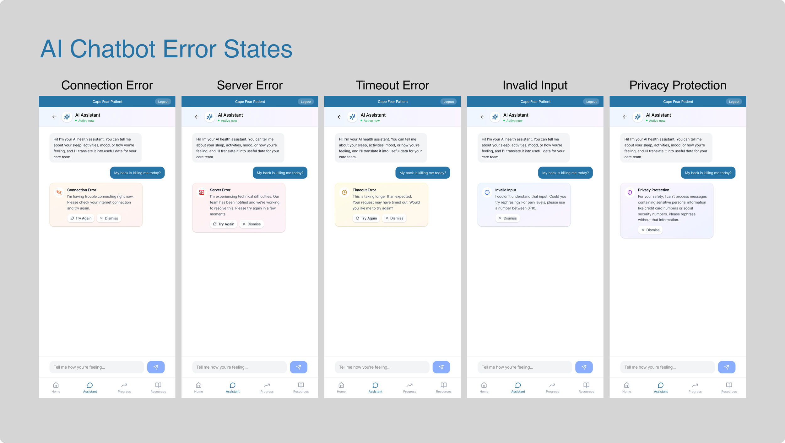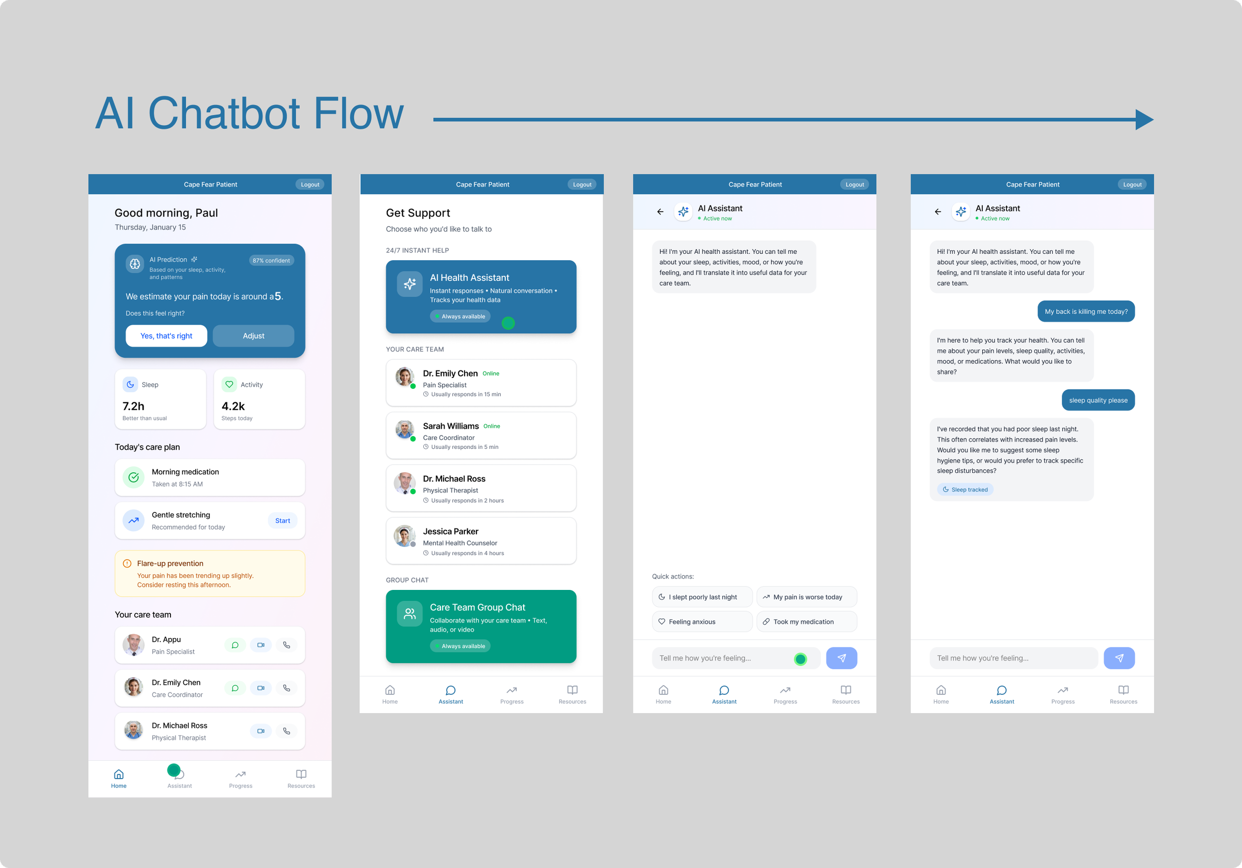 The AI chatbot transforms the pain management app from a passive tracking tool into an active care companion. In the previous version, patients logged pain manually and waited for providers to review the data later. With the AI chatbot, support becomes immediate, personalized, and continuous. The chatbot guides patients through pain check-ins using conversational prompts, helping them describe symptoms more accurately while reducing the effort of data entry. It recognizes patterns in pain levels, mood, activity, and treatment response, allowing it to anticipate needs, suggest next steps, and flag concerns in real time.