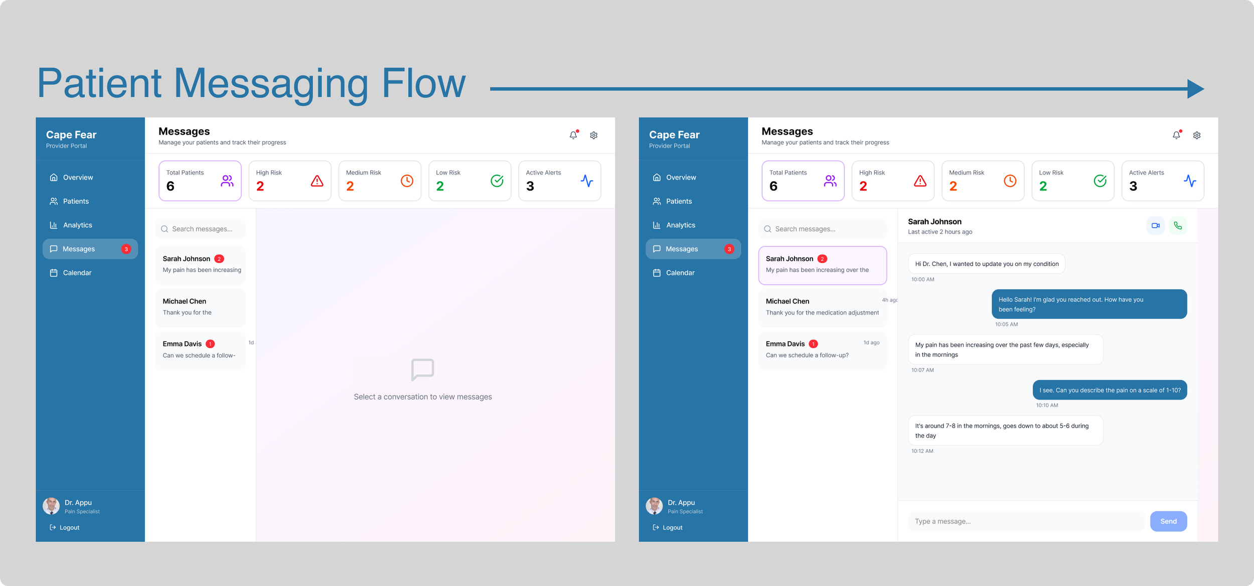 The Patient Messaging Dashboard allows providers to communicate directly with individual patients while maintaining a clear view of their current pain-level risk. Patients are visually organized by status, making it easy to identify who may need immediate attention, follow-up, or routine support. This enables doctors to send timely, personalized messages, intervene early when pain levels rise, and ensure no patient is overlooked. It transforms communication into a proactive care tool rather than a reactive one.