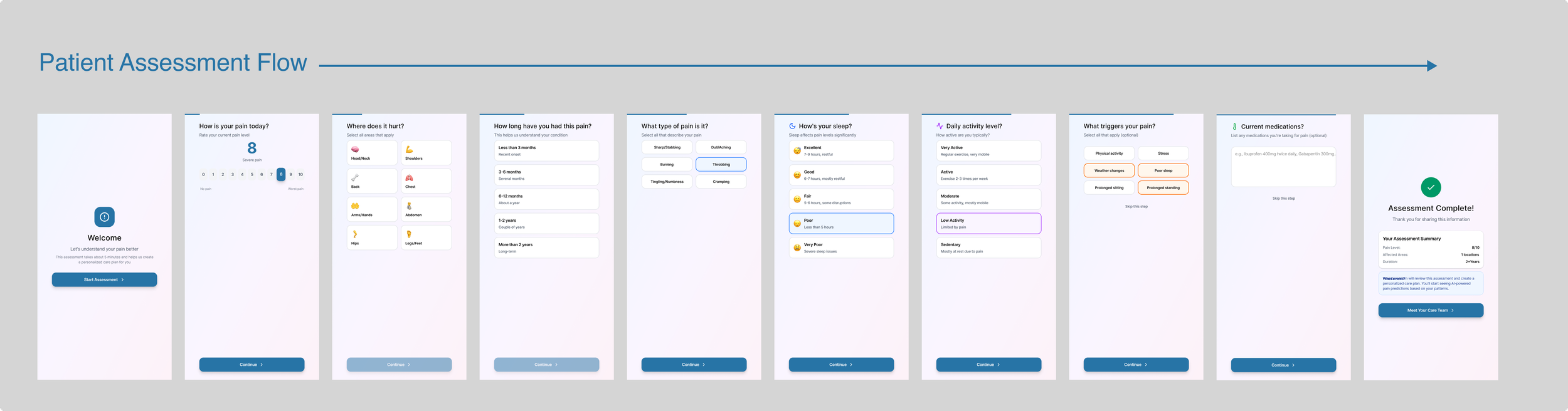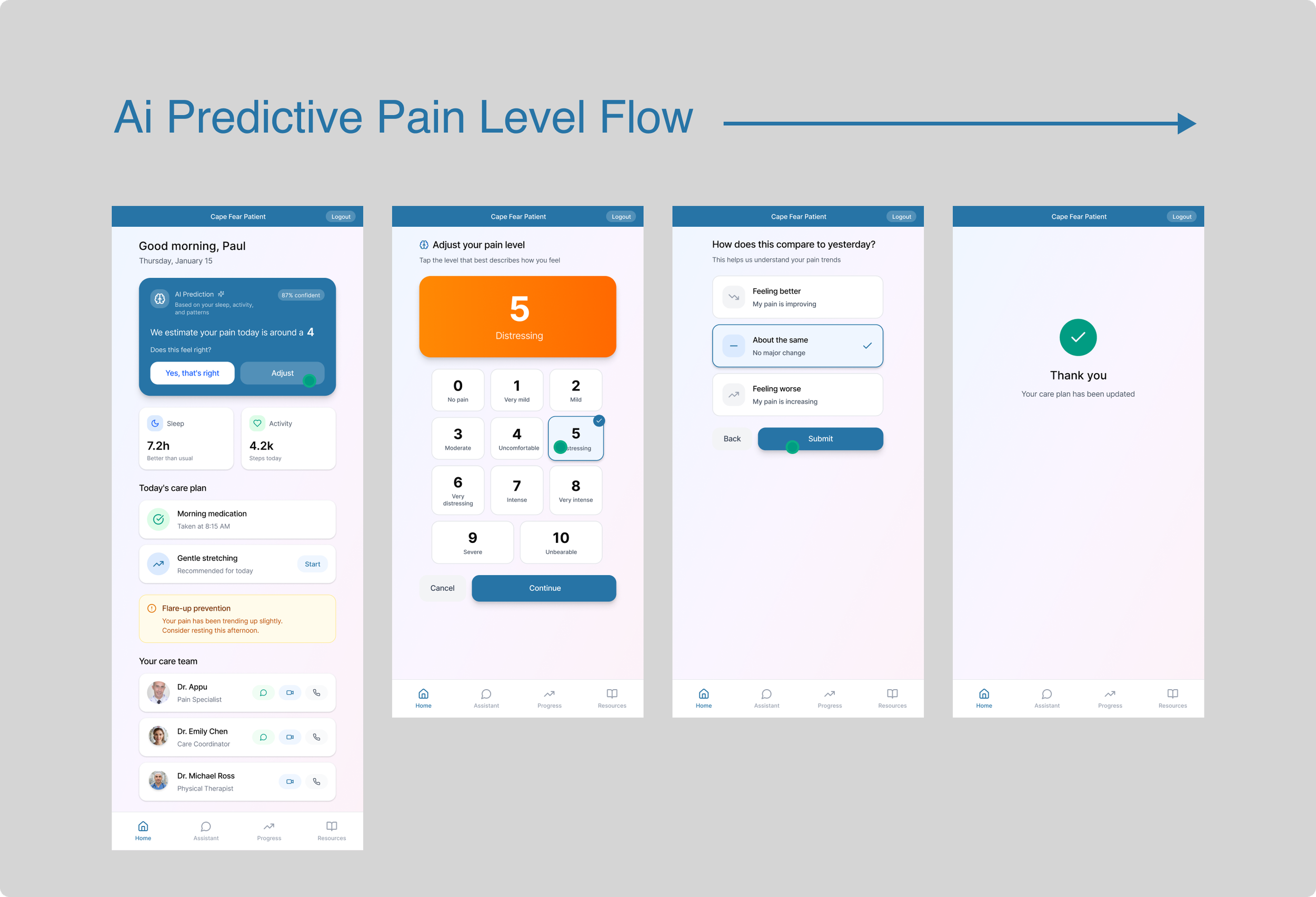 The pain scale remains central to the experience, but AI transforms it from a manual input into a guided interaction. Instead of simply asking patients to log their pain, the system proactively suggests a likely pain level based on historical patterns, sleep, activity, and emotional trends. The user confirms or adjusts with a single tap, turning data entry into validation rather than work.