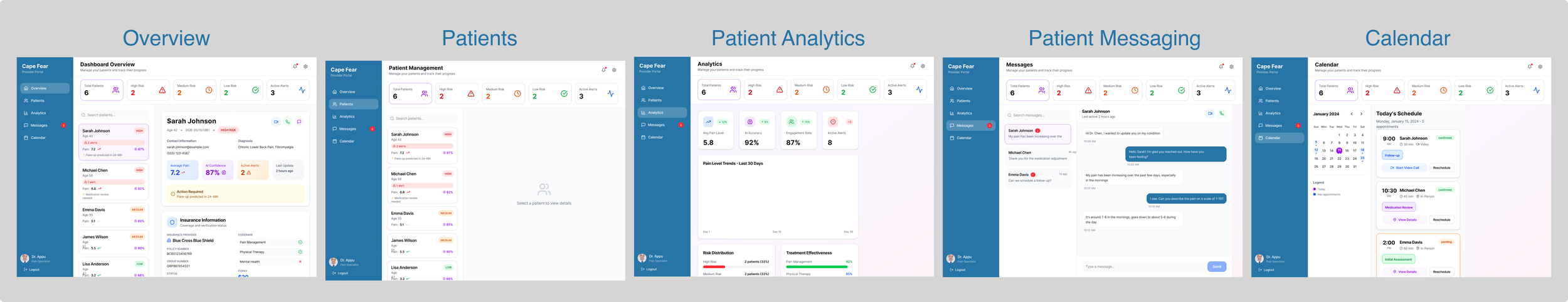 The Provider Dashboard offers a complete, at-a-glance view of patient care and progress. The Overview Dashboard highlights real-time pain levels and overall patient status, while the Patient Dashboard allows providers to drill into individual patient details, history, and trends. The Analytics Dashboard delivers deeper insights into outcomes, patterns, and performance. The Messaging Dashboard centralizes all patient communication for faster, more personal care, and the Calendar keeps appointments, follow-ups, and care milestones organized in one place. Together, these tools create a streamlined, data-driven workflow that helps providers deliver proactive and personalized treatment.
